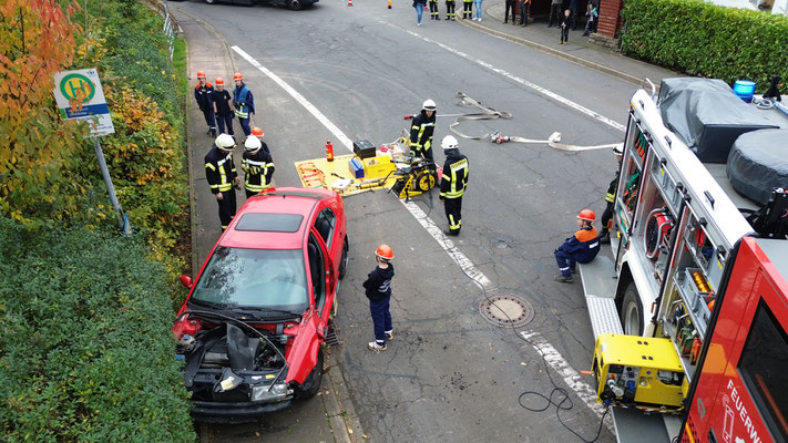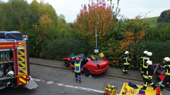 Heute Mittag wurden wir zu einem Verkehrsunfall allarmiert. Beim Eintreffen an der Einsatzstelle fand die Mannschaft einen PKW vor, der im Bereich der Bushaltestelle zum Stehen gekommen war. Zwei Personen waren im Fahrzeug eingeklemmt. Zur Rettung wurde das Dach des Fahrzeugs mit hydraulischen Rettungsgerät vollständig abgenommen, um einen schonenden Zugang zu den Personen zu ermöglichen.