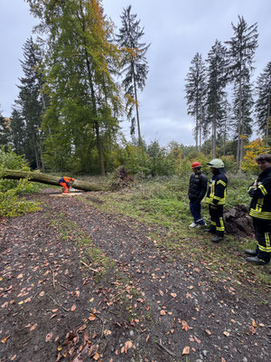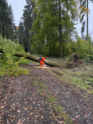 Nach unserem ersten Einsatz meldete uns ein Anwohner, dass im Wald ein großer Baum die Wanderwege Blockiert. Darauf haben wir den Baum mittels Kettensäge entfernt.